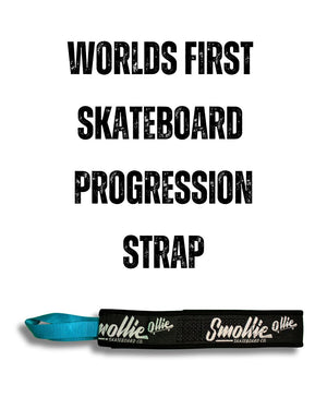 The Smollie Strap is an innovative skateboarding training tool designed to help skateboarders learn new tricks faster and with more confidence. It’s an elastic band that attaches around the trucks of the skateboard and spans over the top of your feet, securing your feet to the board. This setup allows for natural foot movements while ensuring the board stays attached during aerial maneuvers, facilitating easier practice and mastery of tricks.
